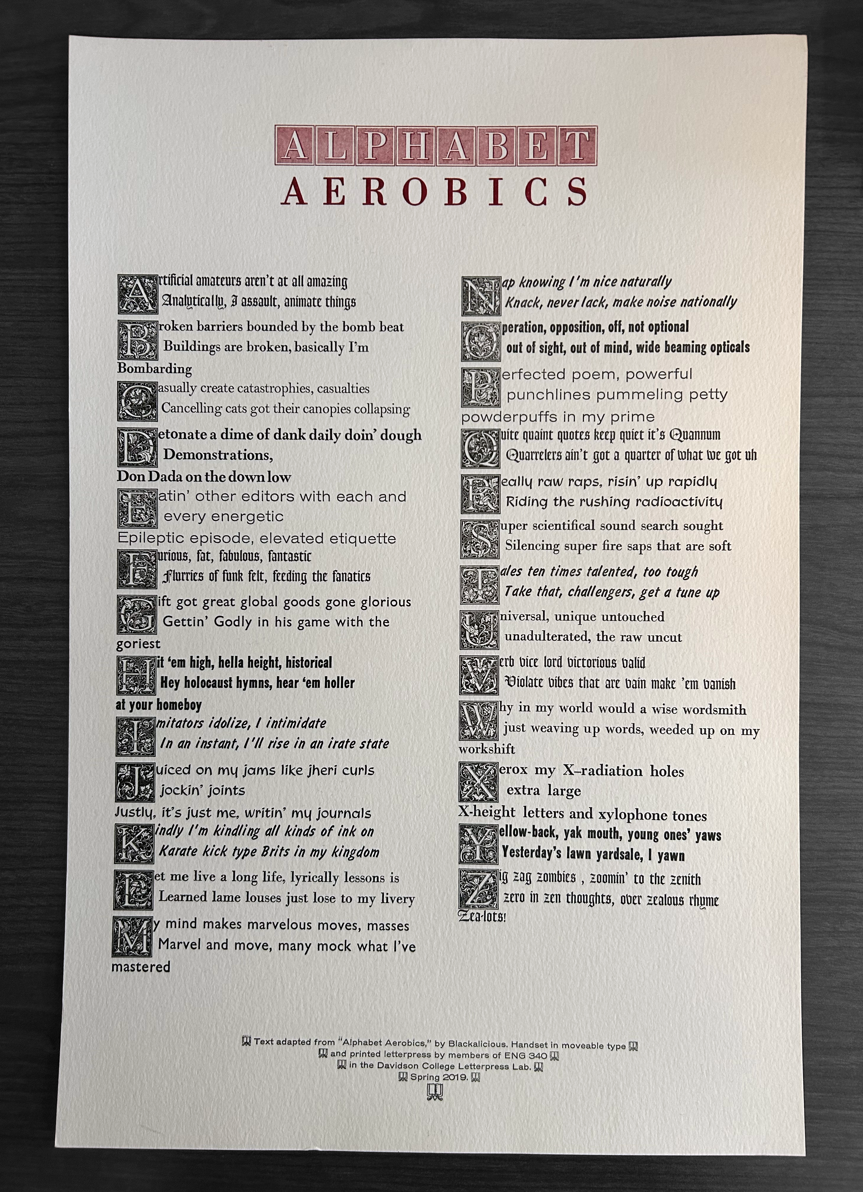 By integrating physical production with academic inquiry and aesthetic exploration, the Letterpress Lab serves offers a space where students can practice creative problem-solving and intellectual and aesthetic expression using the printed medium.