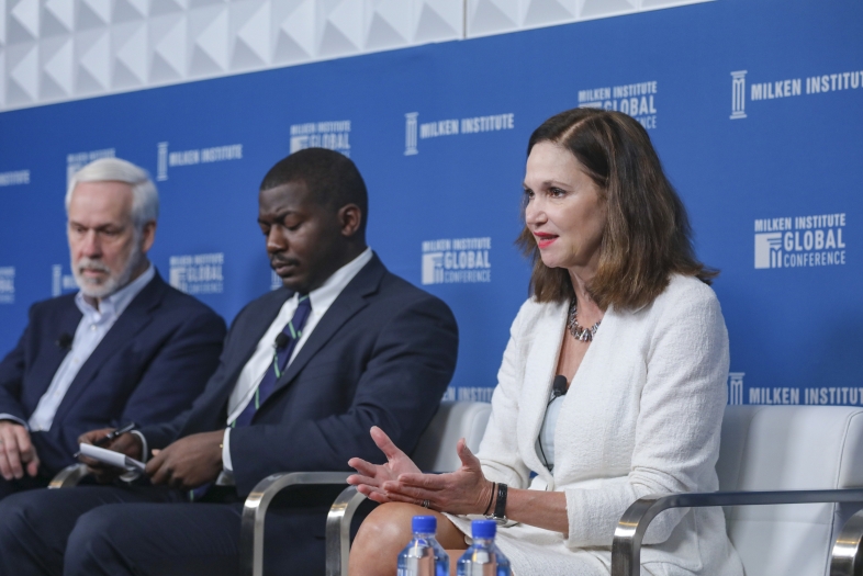 President Carol Quillen (r) joins higher ed leaders at the Milken Global Institute Conference to discuss how higher ed can regain the public's trust. Adam Harris, The Atlantic (center); Paul LeBlanc, Southern New Hampshire University (left).
