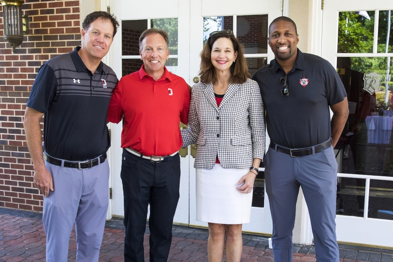 Steve and Jennifer MacMillan’s gift makes athletics history. The gift was announced today at the annual Dr. Tom Scott Memorial Golf Tournament. Pictured (l-r): Head Golf Coach Tim Straub, Steve MacMillan ’85, Davidson College President Carol Quillen and Athletic Director Chris Clunie ’06.