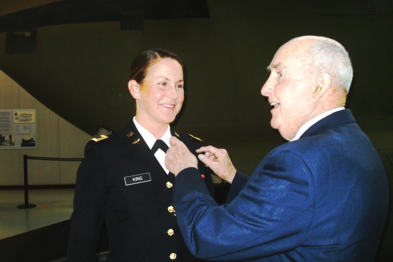Alumnus Retired Air Force Brigadier General John Rose pins aviator wings on granddaughter Emily King at her 2013 graduation from flight school at Fort Rucker, Alabama.