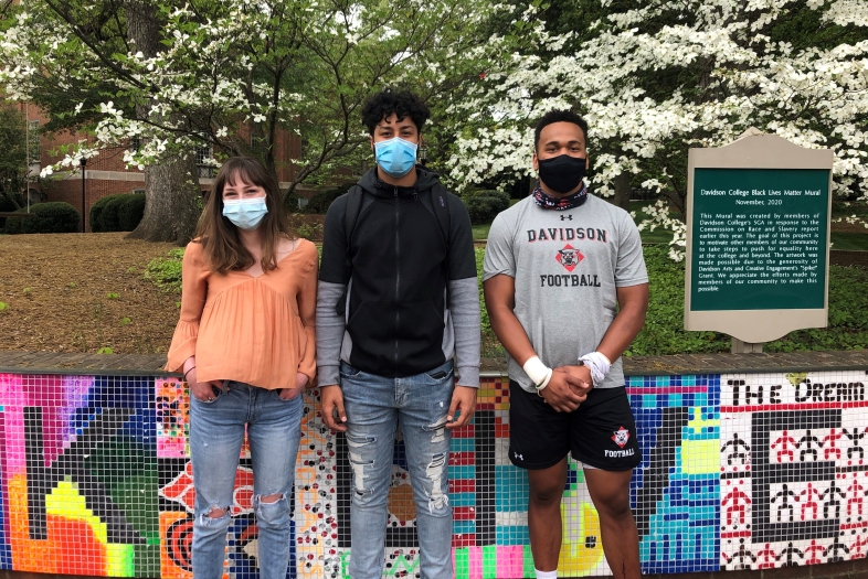 (l-r) Adelle Patten ’21, Israel Palencia ’23 and T.J. Elliott ’21 drove the conceptualization and creation of the Black Lives Matter mural on campus.