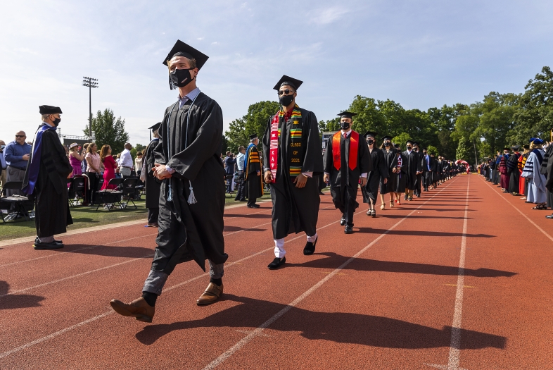 The day dawned cloudy and stayed comfortably chilly as the college bade farewell to the 508 graduates from the class of 2021. The COVID-19 pandemic moved this year’s ceremony to Richardson Stadium to offer more room to maintain a safe distance. A high percentage of vaccination rates within the college community offered another measure of safety.