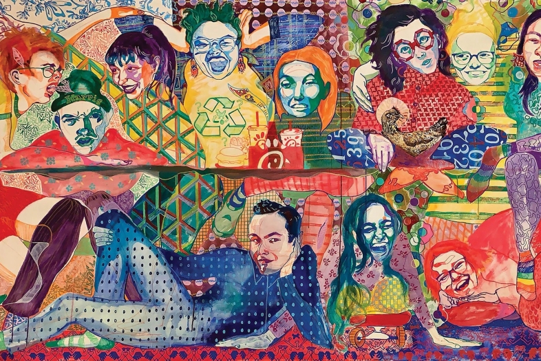 Sup (4'x9'; Acrylic paint and acrylic paint pen on canvas) by Chloe Pitkoff ’21