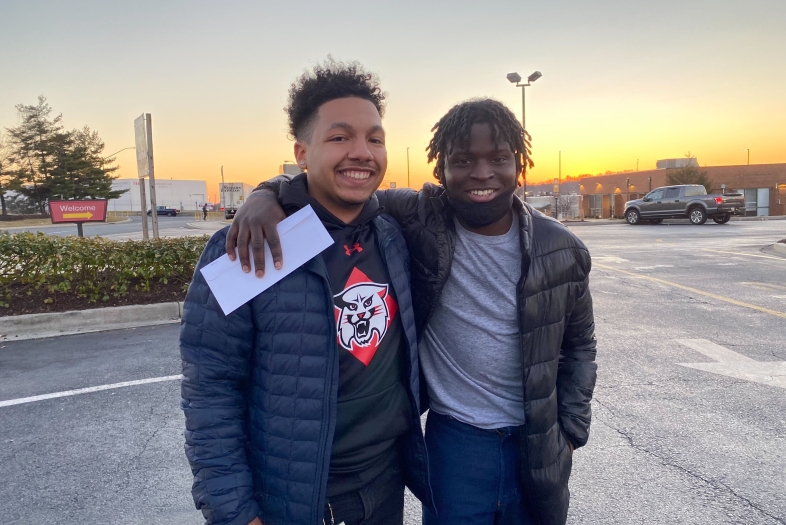 Brandon Reid (Harris) '22 and Sura Sohna (l-r) caught up after Sohna's release from the Patuxent Institute Feb. 8. Reid's work on a project with Davidson College Professor Ike Bailey '95 figured into the court's decision to release Sohna more than a decade before the end of his 14-year sentence.