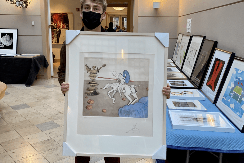 Scauzzo, a classical languages and literature major, bee-lined for a print of a person on horseback charging with a lance at a yellow figure. Bypassing other, more colorful, more eye-catching works, Scauzzo couldn’t resist this one with the large signature in the lower right-hand corner.