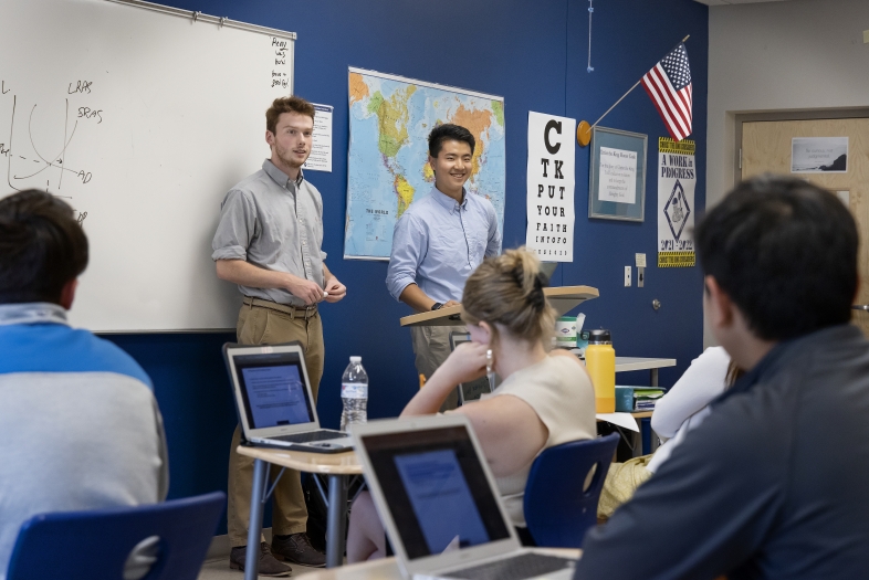 “You specialize in the product you’re best at,” Davidson College student River Meng ’23 said to the Advanced Placement macroeconomics class he was co-teaching at Christ the King Catholic High School, in Huntersville, North Carolina.