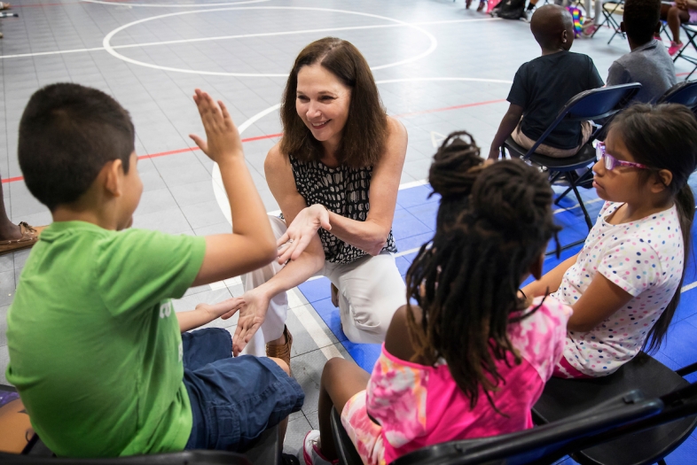 President Carol Quillen will step down in July after more than a decade leading Davidson. Pictured here: Quillen joins Davidson Freedom School scholars for the morning Harambee, a lively informal reading, song and dance ceremony that opens each day of the summer literacy program.