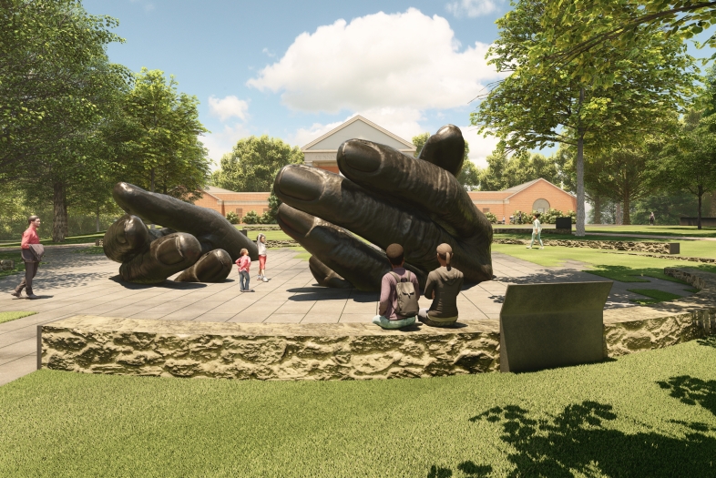 Davidson has selected artist Hank Willis Thomas to create the sculpture “With These Hands: A Memorial to the Enslaved and Exploited.” The concept was developed in collaboration with the North Carolina practice of global architectural firm Perkins&Will, who conceived an intentional place of refuge that responds to and surrounds the artwork. The bronze sculpture—two large, work-worn hands—will stand prominently on the lawn near the original Oak and Elm buildings and be visible from Main Street.