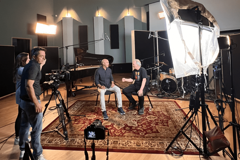 Roger Brown ’78 preparing to interview Harvey Mason Jr.