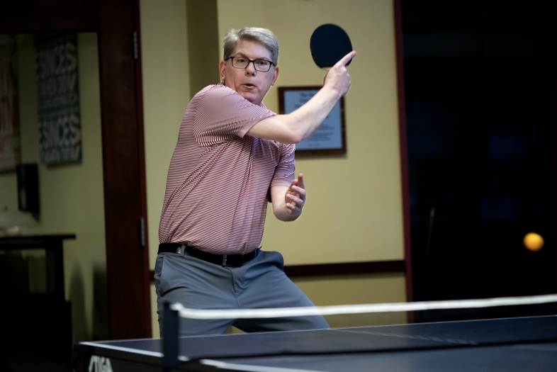 If you’d hoped for a leader who might lob a few easy games your way, he’s not your guy. Just ask the many student competitors whose hopes he’s swatted down during Union game nights. A few dozen matches into his tenure, he remains undefeated.
