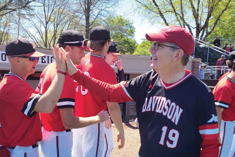 Former Wildcat baseball player Doug Hicks ’90 joined the team at Wilson Field on April 2, the weekend following his inauguration as Davidson’s 19th president. Weather worries led to shifting game times, but Hicks kept his appointment with the team to throw out the first pitch in their three-game series against Fordham University.