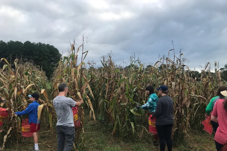 Volunteers harvesting the first round of Catawba Flour Corn grown at the Davidson College Farm in the summer of 2022.
