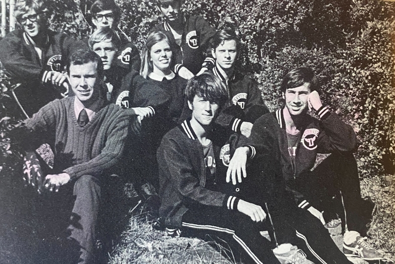 Howard Boyd ’72 with cross country teammates and Coach Sterling Martin '63, from the 1972 Quips and Cranks