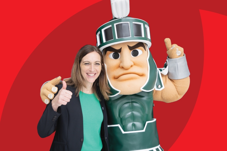 Robyn (Flewelling) Fralick ’04 with the Michigan State University Mascot