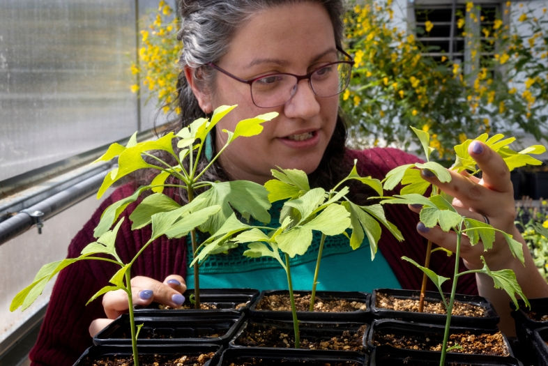 Biology Professor Susana Wadgymar holds a tray of ginkgo saplings