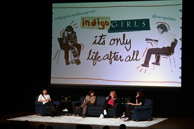 Director Alexandria Bombach, Indigo Girls Amy Ray and Emily Saliers, and moderator James K. Batten Professor of English Emily Drew ’04, on stage at Davidson College for a discussion following the screening of It’s Only Life After All.