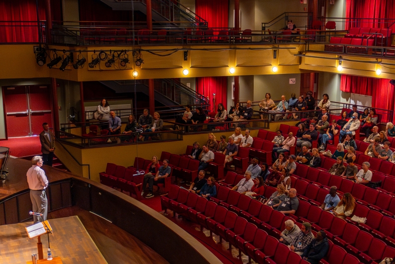 Not limiting my range of modest talent to music alone, I was honored to join the principal actors of the Davidson Theatre Department’s production of Julius Caesar, directed by Professor James Webb. Specifically, as part of Wildcat Weekend, I hosted a public conversation with parents and family members on the exciting things happening on campus. Because we were in the Duke Family Performance Hall, I was standing onstage, on the set of the Shakespearean tragedy. When I mentioned Julius Caesar, the student actors appeared — in costume, in character. As directed, I began to recite Marc Antony’s soliloquy (“Friends, Romans, countrymen,” etc.). The student actors, bewildered and unimpressed, walked offstage as one of them proclaimed, “So let it be with Caesar!”