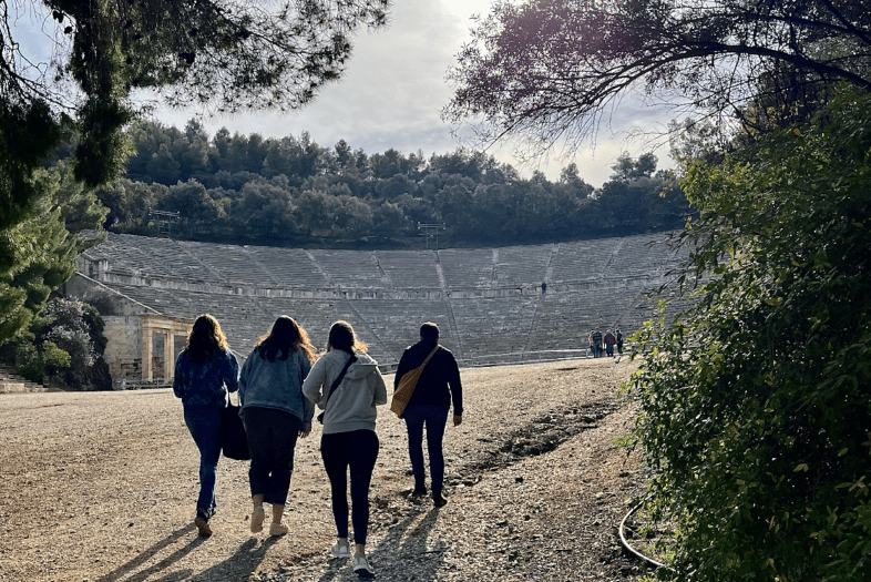 Davidson College students approach the Theatre at Epidaurus, Greece. Photo by Lacey Stephens '26