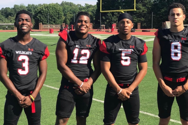 Members of the Davidson College football team with Jonathan Sheperd-Smith ’18 (#12)