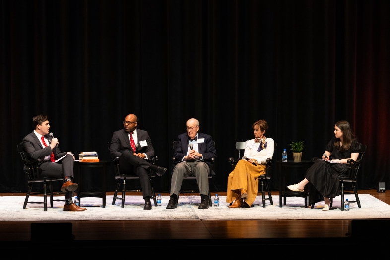 Connor Hines ’26 (far left) and Mary Gray Speakman '25 (far right) moderate a panel conversation with three Davidson alumni: (l-r) Bo Henderson ’01, Davidson Athletics Hall of Fame inductee and community advocate; Dr. John Kuykendall ’59, 15th President of Davidson College; and Mary Tabb Mack ’84, retired CEO of consumer and small business banking at Wells Fargo. The wide-ranging discussion explored how Davidson’s core values have continued to shape their lives after graduation.