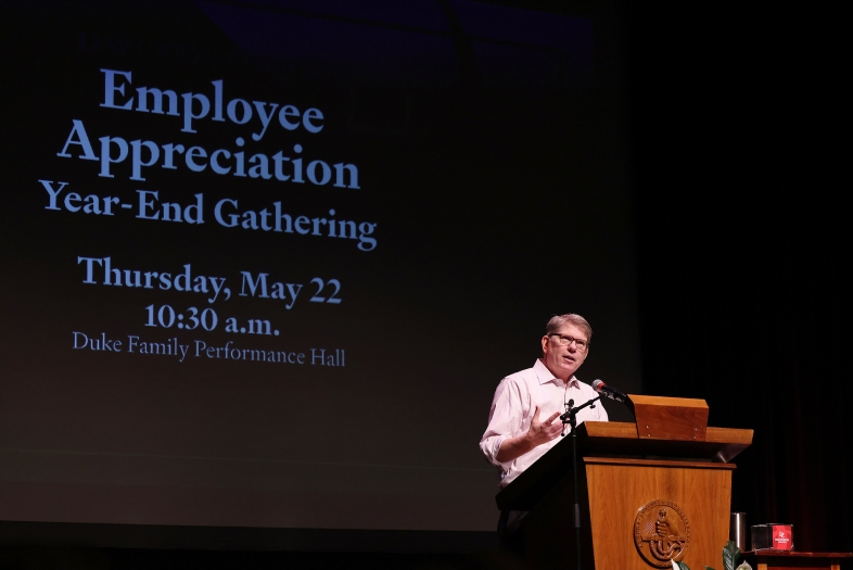 Duke Family Performance Hall was abuzz with applause and laughter as President Doug Hicks ’90 thanked and congratulated employees on a successful academic year, calling out a number of accomplishments from across campus.