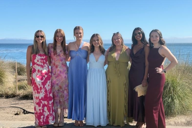 Class of 2017 friends (l-r) Shannon Doherty, Annie Rowland, Paige Buckland, Devon Winsor, Sylvia Strauss, Sabrina Cheema and Katie Belanger in San Louis Obispo celebrating the wedding of classmate Emily Palmer